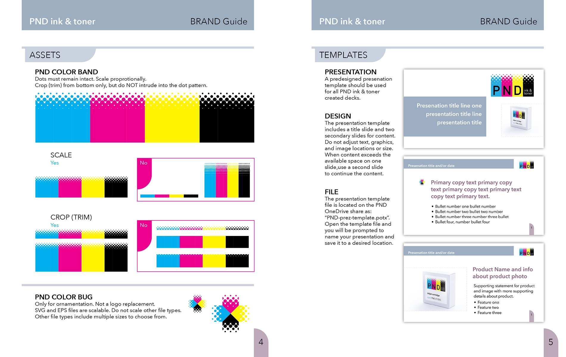 The ink and toner business runs deep and wide. These products display branding from large corporations to one-person garage shops. PND needed a logo that presented them as a credible business providing a reputable product with immediate recognition. The primary ink colors of cyan, magenta, yellow, and black guarantee association with inkjet cartridges and a spray dot pattern presents each color to reinforce the connection. The company name is printed above in black and white for maximum contrast. The logo clearly identifies the type of business and utilizes pure, saturated colors and high contrast to convey the qualities buyers seek in ink and toner. Brand guidelines support the logo through precise instructions for use, ensuring compliance and messaging consistency. The guide also includes secondary colors, logo files, graphic assets, presentation template designs, letterheads, business cards, digital signature, and creative direction to communicate brand culture. This branding solution gives PND a turn-key tool to launch and run its business confidently.